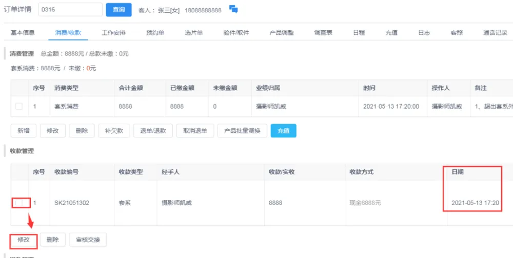 答:通常来说下单的时间没有修改到之前的话,会导致订单时间和订单中的金额会显示在当天,那么修改了订单时间后,收款时间不会同步,所以需要点【消费收款】中去调整收款的时间(如图)