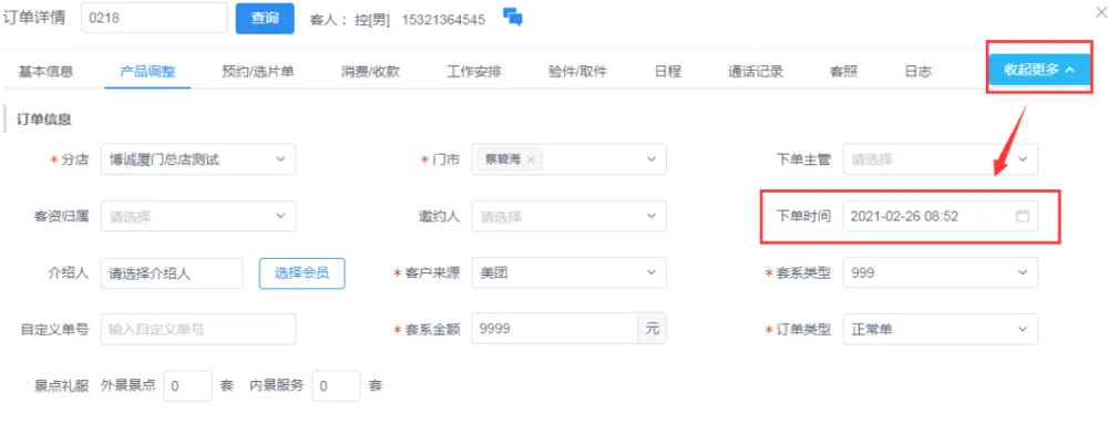 答:通常来说下单的时间一定是默认的当天时间的,但是很多客户上软件后因为之前的订单要输入进去,在确保账目正常的情况下可能会需要调整下单时间;已经订单的需要修改时间要在该订单里面的【产品调整】里面修改(如图)