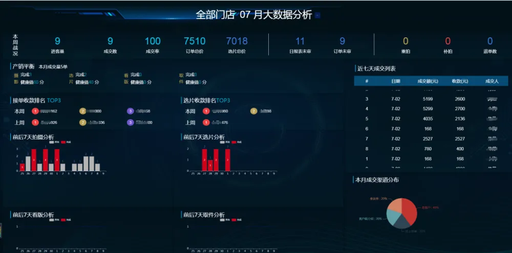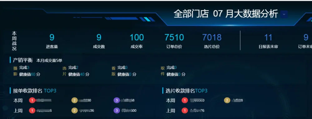 收款排名目前主要分成两个部分,一个是订单的收款排名一个是选片后期消费的收款排名。这个栏目主要分析当下员工的业绩完成情况