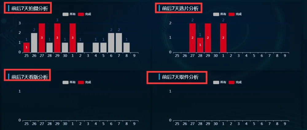 该栏目主要是方便管理层人员通过工作流程的情况知晓最近的工作安排以及前几天的工作完成情况;一定程度上了解工作效率。另一方便该栏目的最近工作分析主要分析摄影、选片、看版、取件等需要客户配合的流程项目;
