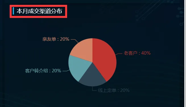 该项目主要以饼图的方式显示当月当下成交订单的客户渠道信息,知晓目前的渠道运营效果和成交效果。