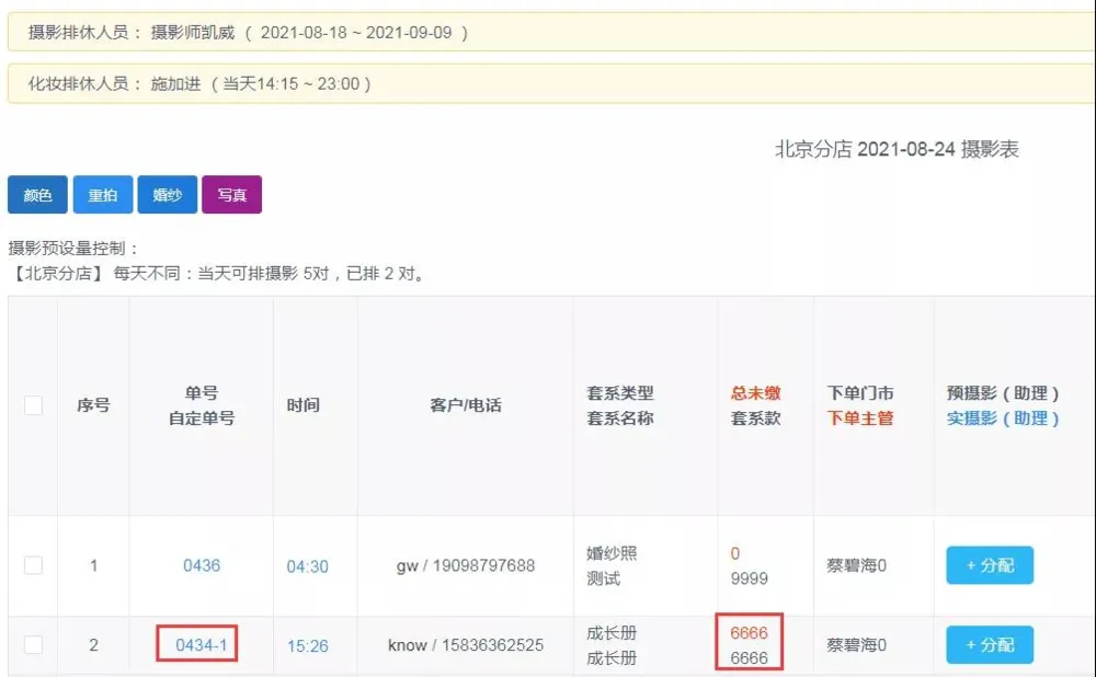 按照总单显示本次拍摄分单的欠款情况,方便企业及时收缴尾款;目前显示的该套系金额和尾款。