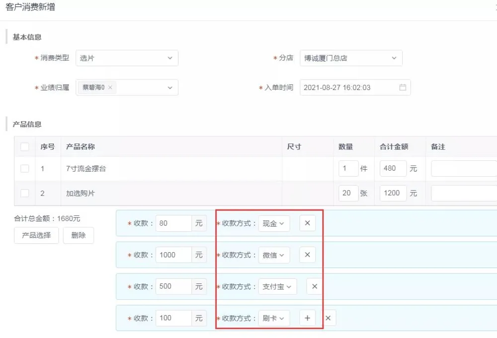 支持在系统消费收款中支出多种收款方式,方便统计不同收款方式的呈现,比如客户缴款6000,其中可能微信2000,支付宝2000,现金2000等可以有五种收款方式。