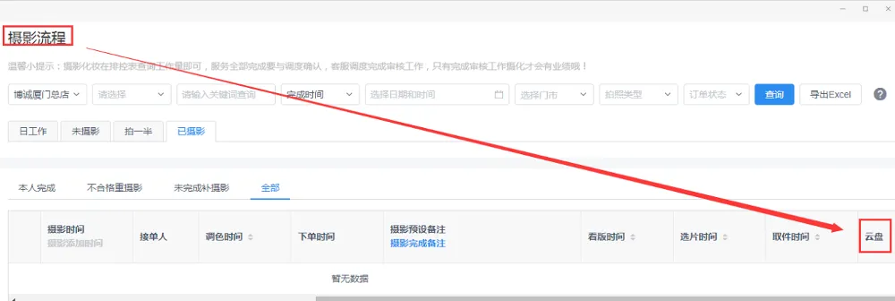 在排空和流程管理中都会显示云盘的状态,方便员工第一时间知晓后期人员是否已经帮客户照片上传云盘了;