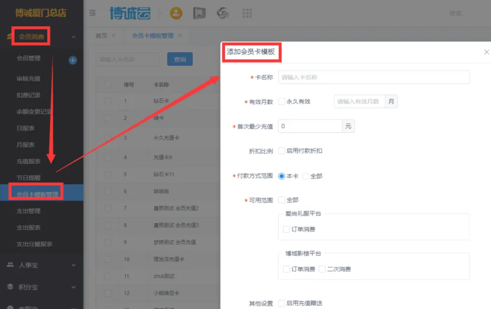 启用储值功能后,需要设置会员卡,这样方可进行储值消费和抵扣的功能。会员卡的设置需要在人力模块宝中的会员管理中新增并设置。设置中需要注意设置卡名称、有效时间、是否可全部消费抵扣以及是否可以赠送等。