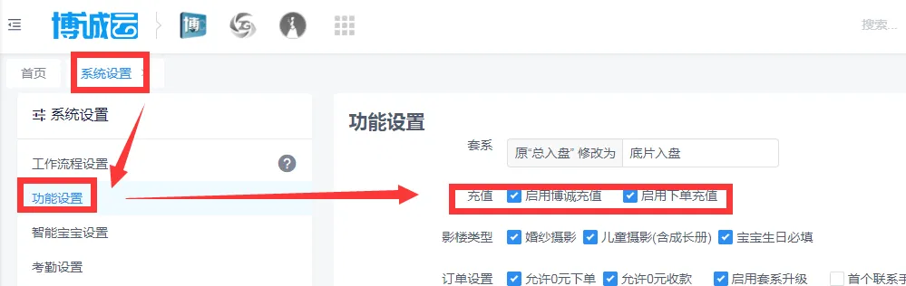 首先,需要您在后台开启账户充值功能,方可出现储值功能的。在博诚影楼管理中,通过系统设置中的功能设置开启充值功能。