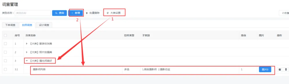 在拍照调查中,首先需要明确您需要调查哪些项目,可以将相同的项目归类,比如针对服装喜好、拍照风格等,然后设置每个类型下可以选择的项目,方便客户选择。设置的顺序是新增大类,然后新增具体分类。