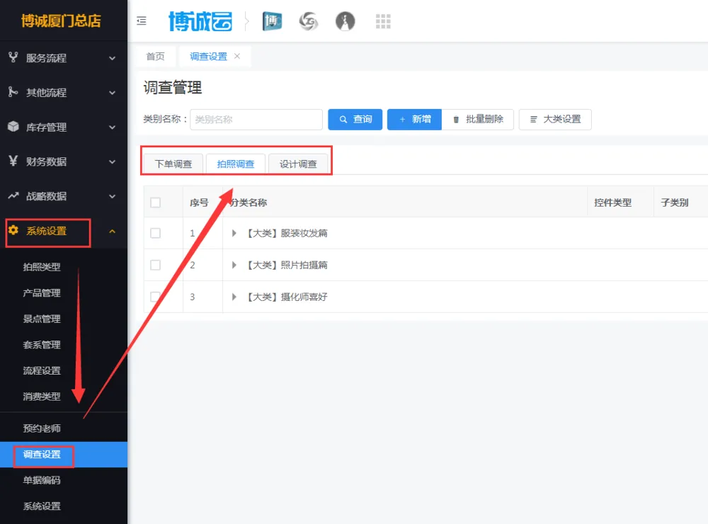 在博诚云影楼管理系统中,左侧的系统设置中有调查设置。需要主要的是,调查管理种类中目前仅提供下单调查、拍照调查、设计调查哦且暂时不支持自定义修改或增加这个调查种类的哦。