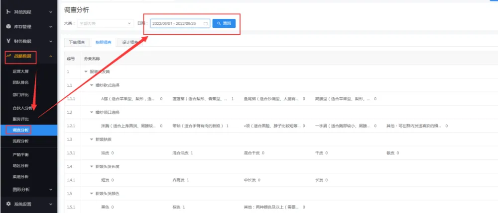 只要有操作了调查的信息,可以在战略数据中查询调查分析的哦,里面可以按照时间段汇总相关的调查项目汇总哦。