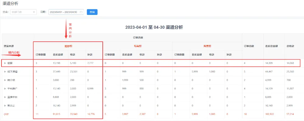 横向分析:主要是针对渠道种类的分析,每个渠道各种订单的数量、业绩、实收、以及补款的分析和统计汇总。