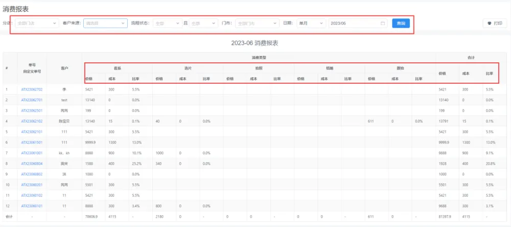 5.客户消费情况可以了解不同种类的消费,以及成本和占比;比如前期套系消费多少,成本多少,占比多少。以及客户的总消费等。