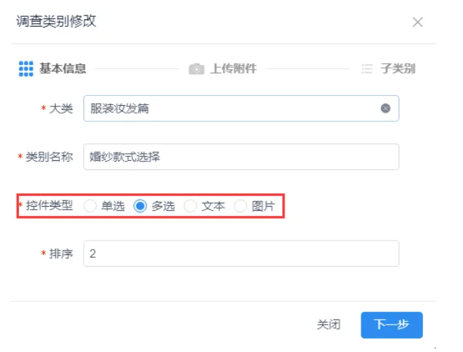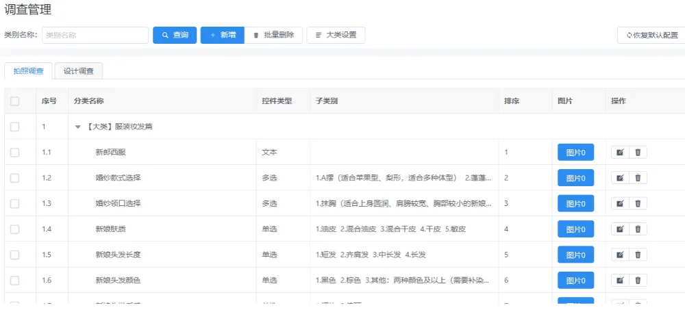 在调查设置中,我们主要会分大类和子类,大类相当于您要询问的问题,子类指的是选项。所以您大类主要设置需要调查哪些事项。子类可以设置文本、单选、多选。文本指的是客户可以直接输入文字,单选和多选就是增加多个子类,只能选择单个或者可选多个。同时也支持上传图片的方式。