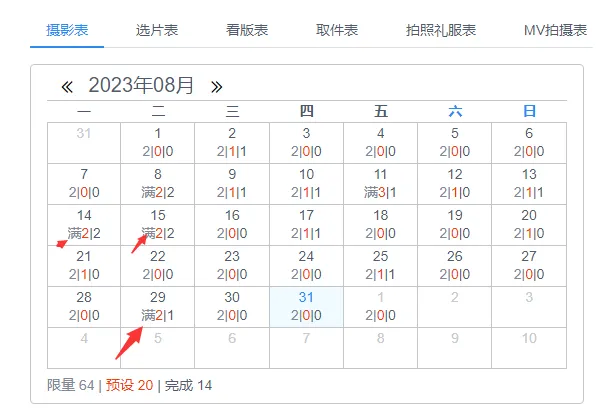 以上图为例:当启用每天预设量控制的时候,如果已经安排满客户后,排空会显示【满】字;月历的每天通常会有三个数字,第一个数字代表当天可以安排的数量,安排满即不显示数字显示为满;第二个数字指的是当天已经安排的数量;第三个数字指的是已经完成的数量。
