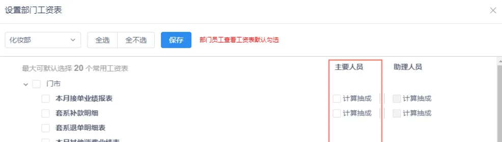 博诚云管理系统中有为企业用户提供工资表,工资表中有提供很多的表格方式,企业用户可以根据自身需求勾选即可显示相应的表格以此来作为工资抽成参考,那么如果需要设置工资抽成的话要如何设置呢?