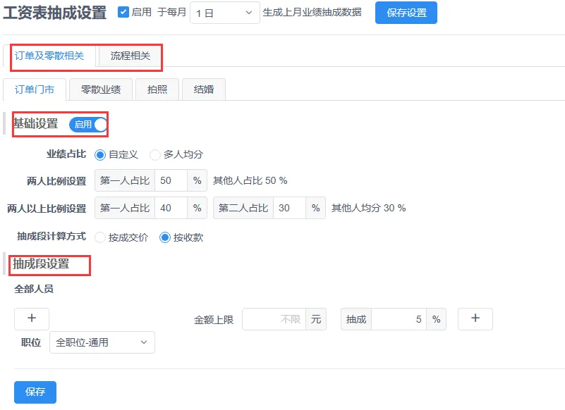 如果您需要启用工资抽成设置,您可以选择在【系统设置】=【更多设置】中的【工资表抽成设置】中启用。启用后可以选择订单相关以及流程相关的设置。其中订单设置指的是针对订单消费的抽成设置,比如门市销售订单等;而流程相关的抽成设置主要针对技术部门比如摄影流程、设计流程等。
