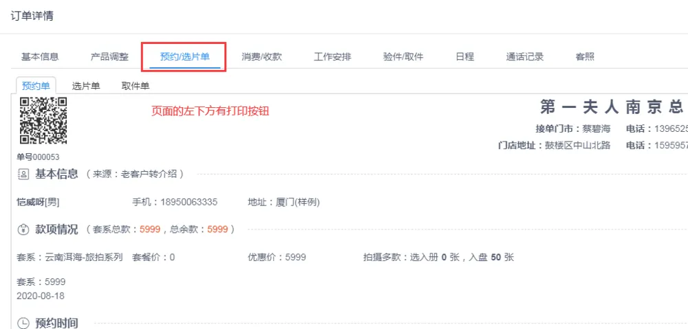 第二步:查找出来后,点击客户单号进入订单详情页面中的【预约/选片单】中打印预约单并配合门市让客户确认签字即可。(同理在此页面亦可打印选片单)