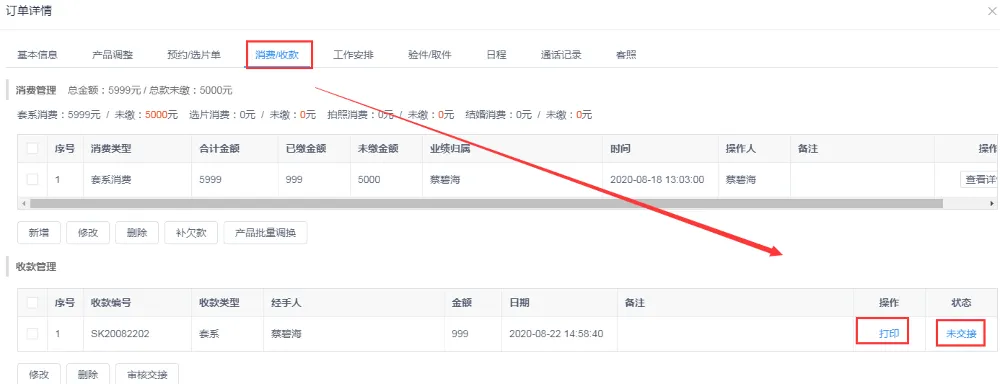 第三步:打印收据单;同样在客户订单详情页面点击【消费/收款】中该步骤中的收款管理打印;【消费/收款】不单单适用于打印定金收据,也可以打印补款、后期消费以及其他的消费等。方式打印相同。(ps:建议打印前检查收款方式、金额等信息正确无误点击未交接审核一下)