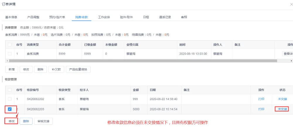 第二:修改收款信息(前提是未审核,如已审核只能找负责人删除这笔信息重新补录)