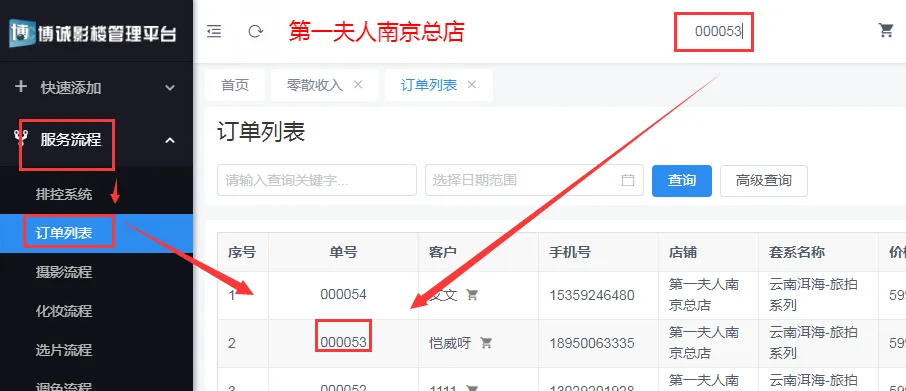 首先、需要我们在系统中查找出需要补款的客户;可以在左侧的【服务流程】中的【订单列表】或最上放的搜索按钮中找出客户;