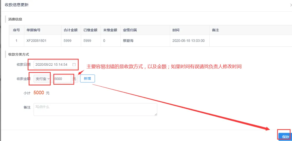 通常情况下,收款的操作中包含收款金额、收款方式、以及相应的时间或者您自行备注的信息。那么如果您在操作过程中发现其中任意一项信息错误了怎么办呢?