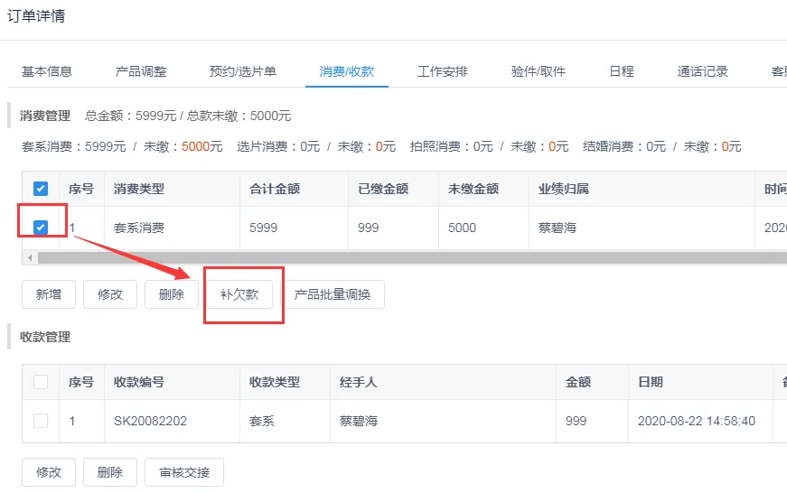 其次,点击单号进入订单详情中的【消费/收款】中进行补款操作,请选择您要补款的消费项目打钩【补欠款】操作保存后即可打印;同理,如果您可以在任何时候在此位置给客户的任意消费项目有欠款的进行补款。