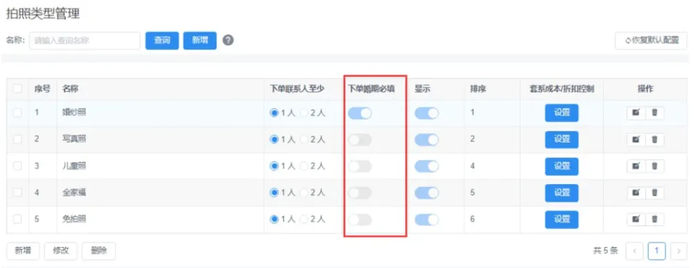 企目前婚期必填项的设置主要与拍照类型有关,比如您企业提供多种类拍照类型的情况下,可能只需要婚纱照要必填婚期,其他的不需要必填婚期。因此我们的必填项设置主要围绕拍照类型来设置。