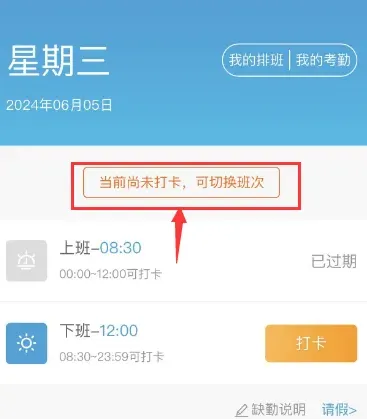 1.每天首次打开APP会有默认考勤时间,未打卡下可变更班次;