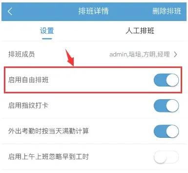 当您启用参与排班人员考勤后,在设置页面可启用自由排班模式。