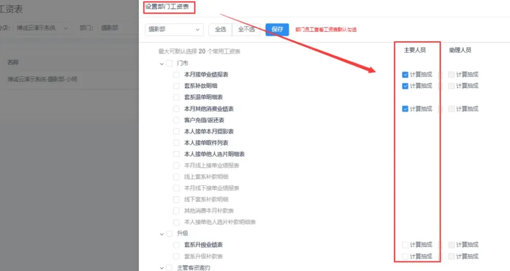 博诚云系列中的摄影ERP管理系统中,最初我们有工资表抽成设置的功能。之前我们也分享过如何启用和设置工资抽成。但是可能很多客户还是有点疑问,以及我们根据客户使用情况优化和完善了部分功能,借助公众号分享具体的设置解析以方便用户参考。