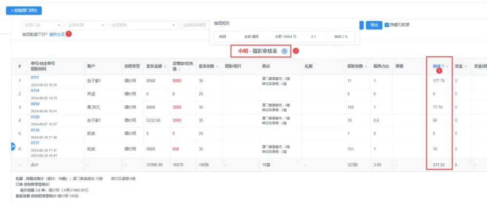 相较于原先显示的方式,最近工资表抽成优化了如下图相关的显示,并对数据汇总异常完成了修复。以下图为例,序号1可以生成具体数据、序号2增加了图标显示可以点击查看详细的抽成比例、序号3统计了每个订单对应的提成并为您汇总在最下面。另外如对提成有疑问亦可点击单号进去,在基本信息中查看工资抽成设置哦~