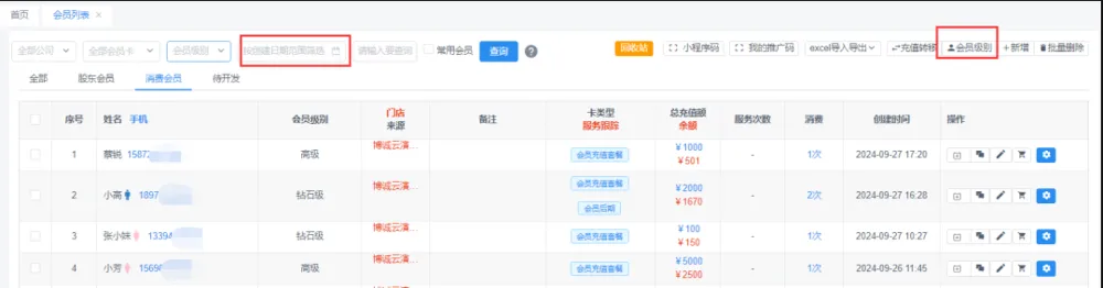 作用:在会员管理列表中的时间段筛选的增加,方便企业在限定某个时间内的客户资料查询与导出。同时对会员级别等级的设置方便对不同客户群体来划分便于企业后续的维护与开发。