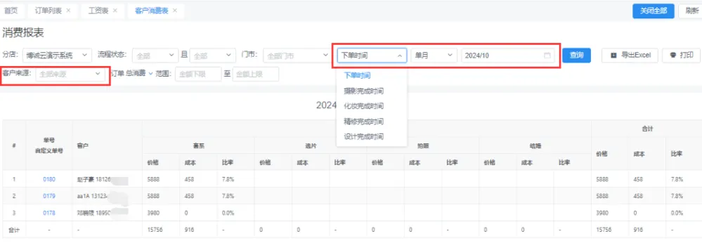 作用:当您启用MV流程后,对应的服务流程在确认工作后可以在【财务】中的工资表内找到工作表设置中设置该类相关表格显示,方便财务统计相关服务人员的工资抽成;同时在【财务】一栏中的【客户消费报表】增加流程时间以及客户渠道来源来查询和分析企业的消费用户便于客户维护与经营情况。
