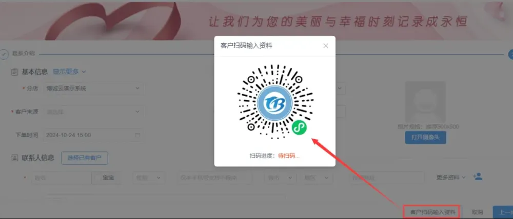 博诚云系列产品下的摄影ERP管理系统中目前针对在店内的客户,如需订单的客户,如何让客户参与订单流程、避免询问或输入错名字的尴尬?对于可能存在的这种问题,博诚云摄影ERP增加了客户扫码输入资料的功能。