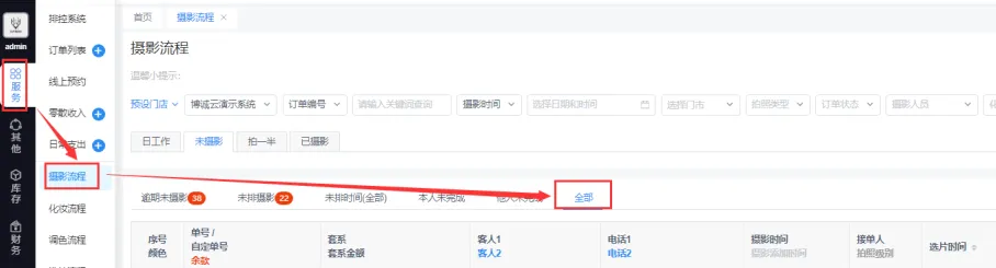 获这个数据可以在软件左侧的【服务】里面的对应的流程中的【未摄影】中筛选,对未服务的客户可以及时催拍让档期正常化甚至可以加大档期安排消耗掉未服务的客户数量,这样也是为后续的相关活动减少“生产”压力,毕竟未服务的客户遗留太多都属于企业“挂账”信息。