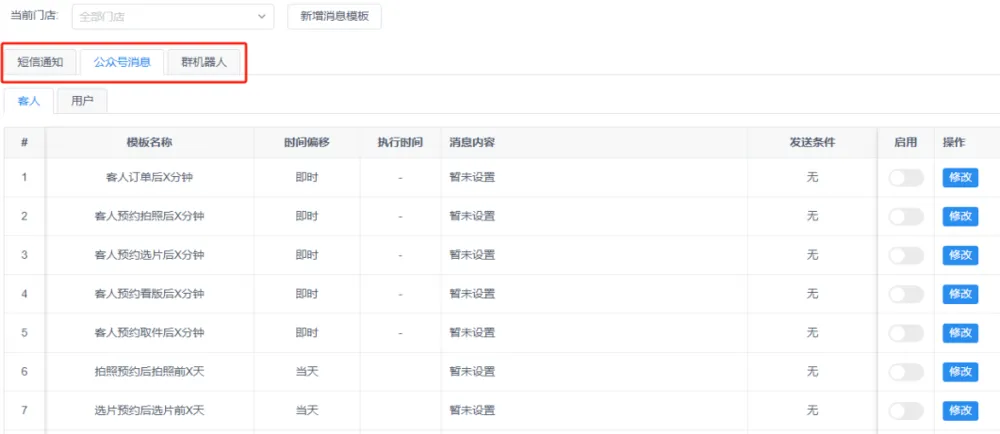 首次设置,或者之前设置因升级问题需要重新设置的,可以在博诚摄影ERP中左侧的【设置】=【更多设置】中的【消息提醒】中设置(如下图);对应的可以选择你需要的启用类型如短信通知、公众号消息等。点击蓝色【修改】按钮里可以选择启用,也可以对应编辑相关内容...