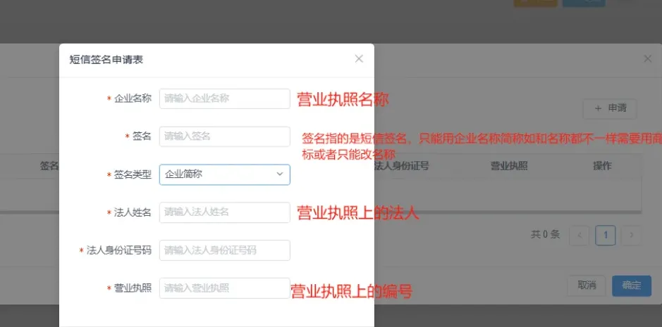 如上图所示:您提交的短信签名需要和您营业执照上的名称编号以及法人对应的身份证号码一致。签名需要使用企业简称,如果签名和企业名称差距太大会影响短信发送,如果名称不同可以推荐选择签名类型为商标并提交商标编号。如果都没有的情况下,建议签名使用企业营业执照的简称执行,然后店名在短信内容中体现哦。最后短信签名需要控制在12个字以内,不得超过12个。
