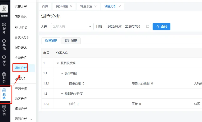 只要有操作了调查的信息,可以在战略数据中查询调查分析的哦,里面可以按照时间段汇总相关的调查项目汇总哦。ps:标准版以下版本用户没有战略功能,可咨询业务人员自费升级哦。