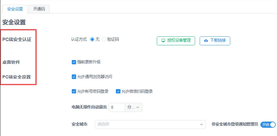 如上图所示;PC端的安全设置主要有两种类型:首先是PC端安全认证,这个通常指的是在原有输入商码、账号和密码的基础上增加需要输入设置的验证码。这里的验证码指的是上图中企业管理员自行设置的验证码不是我们习惯理解的手机短信验证码哈。其次是PC端的安全设置,这个设置可以设置是否允许通过浏览器来登入软件、是否允许通过账号密码或者扫描登入、是否设置允许电脑无操作的情况下多久自动退出已登录的账号。最后是是否启用非安全城市的登入。