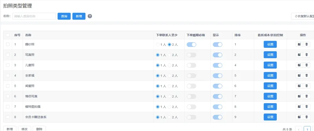 拍照类型通常指的是不同的套餐服务所属的拍照类型。根据不同的类型可以为我们区分现有销售的情况。可以在博诚云摄影ERP软件中的【设置】=【拍照类型】中自定义不同的拍照类型,方便后续统计。