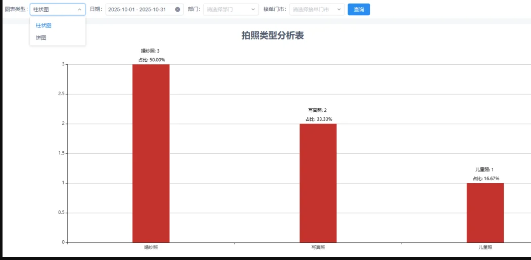 在左侧的【战略】中的【图形分析】中可以找到【拍照类型】进入拍照类型分析表。在该分析表中,可以按照时间段,来查询不同的服务种类,通过条件可以得到具体的数据分析。企业管理层可以通过数据统计来分析该时间段内的订单情况,是哪些拍照类型订单多,同时可以结合其他套系分析报表评估企业的套系畅销与滞销的价格定位等,后续可以根据业务调整来合理的调整价格以及拍照类型尽可能避免“服务成本浪费”;该报表提供柱状图和饼状图,也支持按照部门和销售人员来区分查询哦~