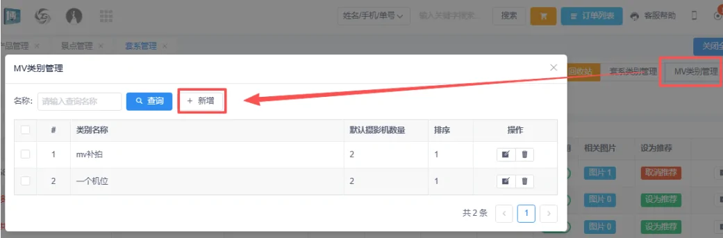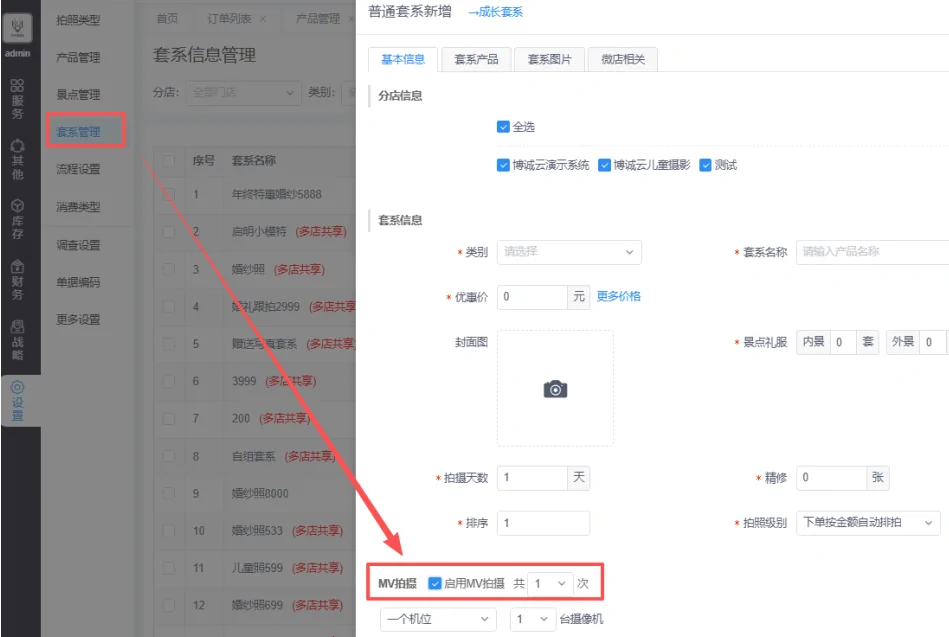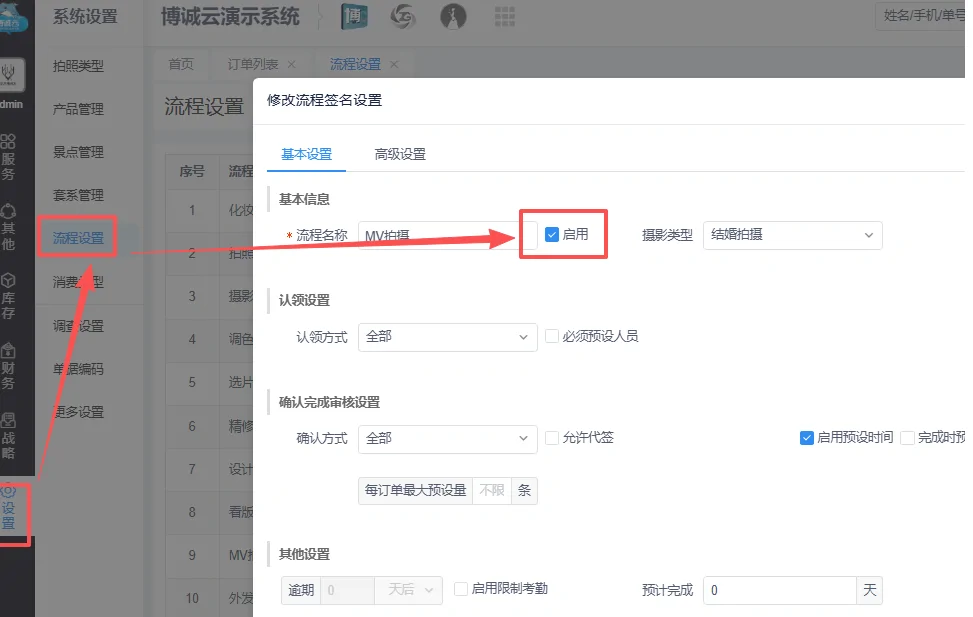 首先需要在博诚摄影ERP中左侧的【设置】中的【流程设置】中启用MV流程。启用后可以根据自身需求,在【设置】-【套系管理】中的右上角【MV类别管理】中新增不同种类的类型用于后续服务安排。