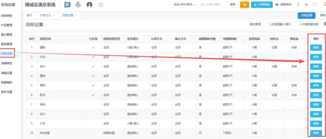 博诚云摄影ERP目前提供15个流程,其中多数流程是通用的,比如摄影流程、选片流程等;流程是可以自定义的。因此如果不需要的流程可以不启用,让流程看起来更符合自身企业;如果有些企业特需的流程也可以利用暂时不用的流程来修改自定义名称来加入流程中使用。但是15个流程无法再增加的。