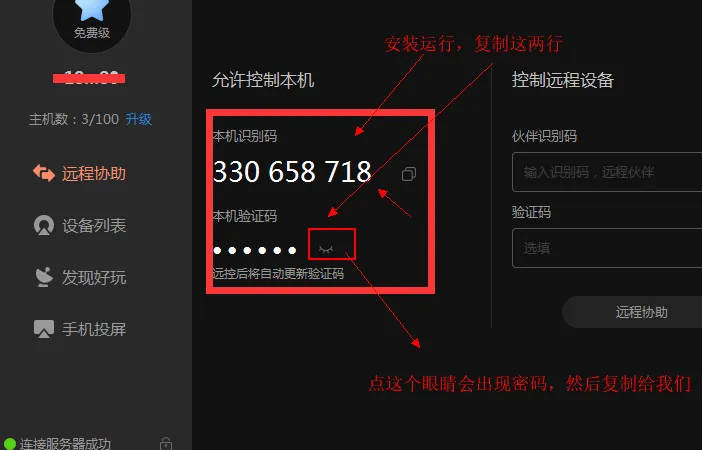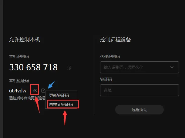 您需要将眼睛“睁开”,然后点击修改按钮,选择自定义,输入您自行设置的验证码提供我们远程链接,建议简单一些方便客服或技术人员输入快远程也快,然后处理完后您可以自己修改复杂的,下次再远程时可以再更改。