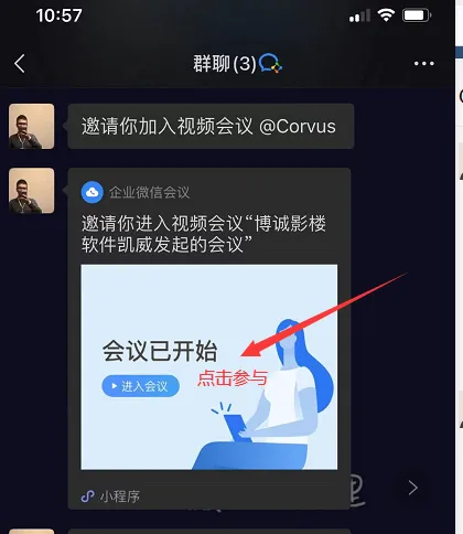 通常情况下,我们在您软件前期会帮您建一个企业微信群做服务跟踪,所以我们博诚服务人员通常会在群里发起会议邀请,发起后邀请参与入会的人员微信会收到提醒,您只需要点击进入会议即可。